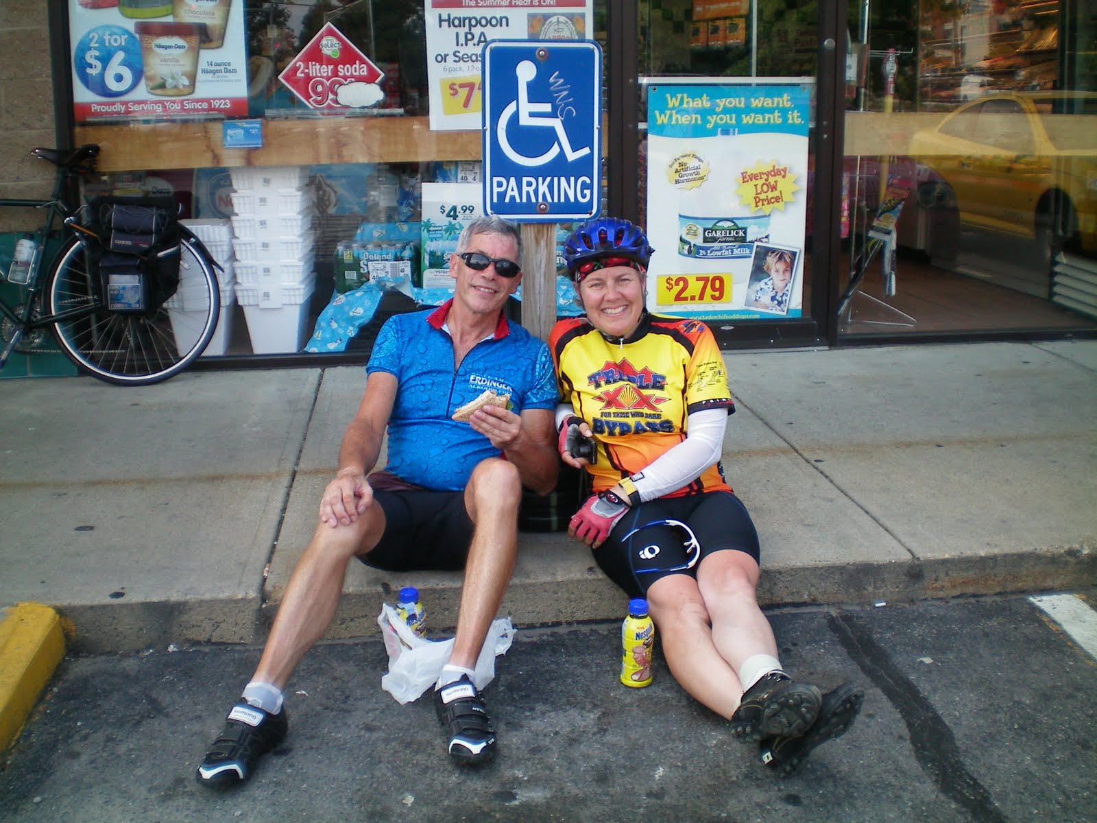 The last full day, 80 miles into New Hampshire. This picture with Sandy says it all. Friendship, admiration, tired, happy, hungry, simple pleasures, kind of low-key location for lunch, our favorite chocolate milk....and we are handicapped!! Tonight we have the "Banquet", the final dinner together. Expect lots of expressions of what the trip meant, some stand-up comedy (mine is on SAG stops), and closure on the great adventure. Tomorrow, we bike to the Atlantic Ocean.